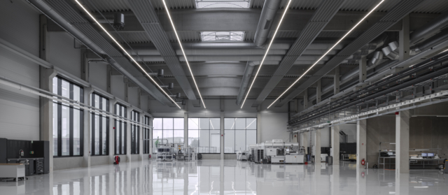 FUJIFILM medwork GmbH was looking for a smart lighting solution for the new construction of a production hall for medical devices in Höchstadt a. d. Aisch. This solution was to integrate high-quality LED industrial lights into the company's existing KNX system without any problems, to blend in visually as harmoniously as possible with the modern architecture of the hall and also to be compelling in terms of cost.