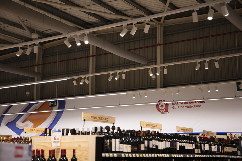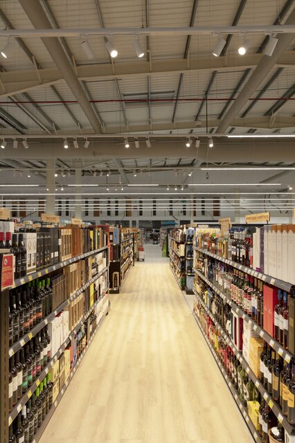 The 450 units of the luminaire system TRUSYS PERFORMANCE 35W/4000K from LEDVANCE for general lighting in all stores proved to be the best option. To complete the general lighting, 290 of the flexible TRACKLIGHT SPOT luminaires with excellent color rendering of CRI > 90 were combined to form an encompassing solution. In the shop areas where the merchandise should be visually enhanced, the TRACKLIGHT SPOT luminaires can be rotated and swiveled according to the shelf layout. This provides flexibility in the clothing and wine areas, highlighting the merchandise optimally.