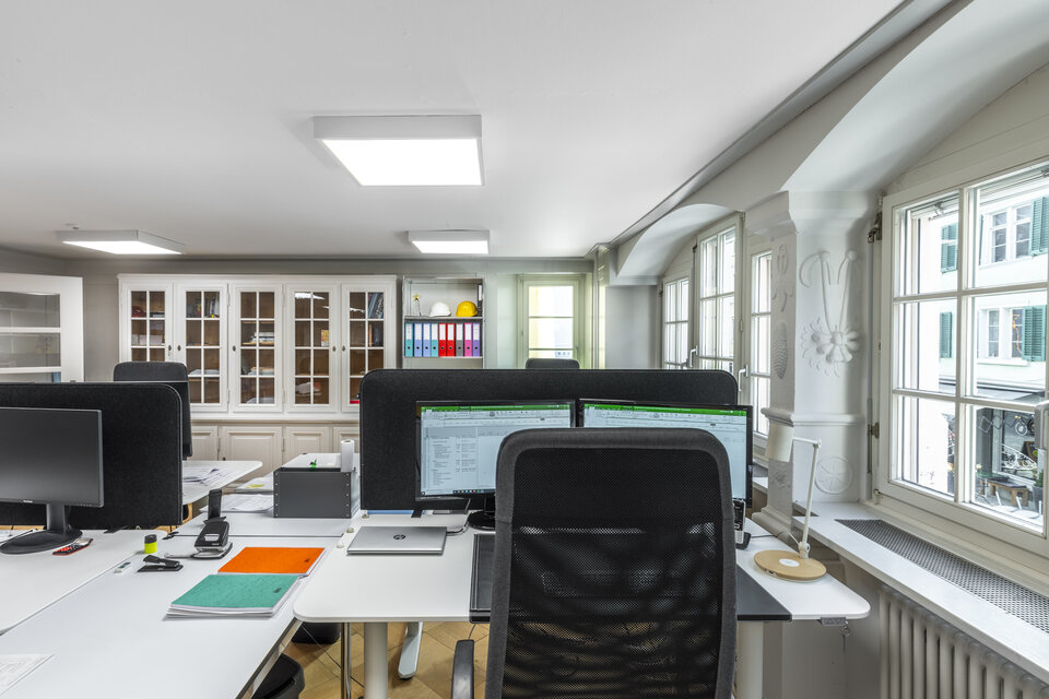 På moderne kontorer skinner lyset kun der det virkelig trengs – og så nært som mulig til kravene til de respektive arbeidsplassene. Med dette i bakhodet skulle kontorene til byggefirmaet Valda & Partner GmbH i en verneverdig bygning i Winterthur med lave takhøyder utstyres med et plassbesparende, effektivt og fleksibelt belysningssystem. Dette skulle gi mer lys til kontorene og samtidig skape en hyggelig atmosfære for ansatte og besøkende.