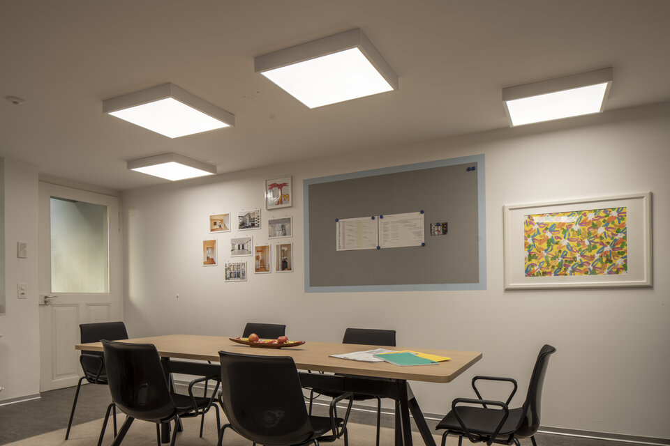 Den moderne LED-belysningen i henhold til DIN-standarder skaper mer plass ved å eliminere gulvarmaturer og letter arbeidet ved skjermen. Og enten det er en kundepresentasjon eller en felles lunsj – med de lett valgbare lysprofilene til VIVARES-systemet kan belysningen i møterommet nå fleksibelt tilpasses den respektive møtesituasjonen. I tillegg er lyskvaliteten og intensiteten i rommene betydelig forbedret fra gjennomsnittlig 300 lux til gjennomsnittlig 700 lux. Og takket være åpen energiovervåking via VIVARES skytjeneste, har kunden alltid kostnadene klart og enkelt under kontroll.