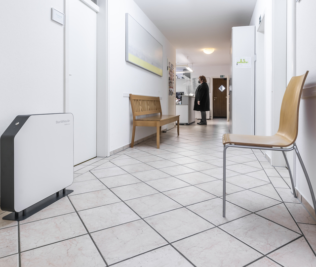 SteriWhite Air Q330 luftdesinfiseringsenheter er veldig stillegående og passer godt inn i den daglige driften på legekontoret. Siden de er flyttbare, kan enhetene brukes fleksibelt på legekontoret avhengig av antall pasienter i de enkelte venteområdene og de gir den best mulige tryggheten. Samtidig høres det nesten ingen støy fra enhetene i drift.