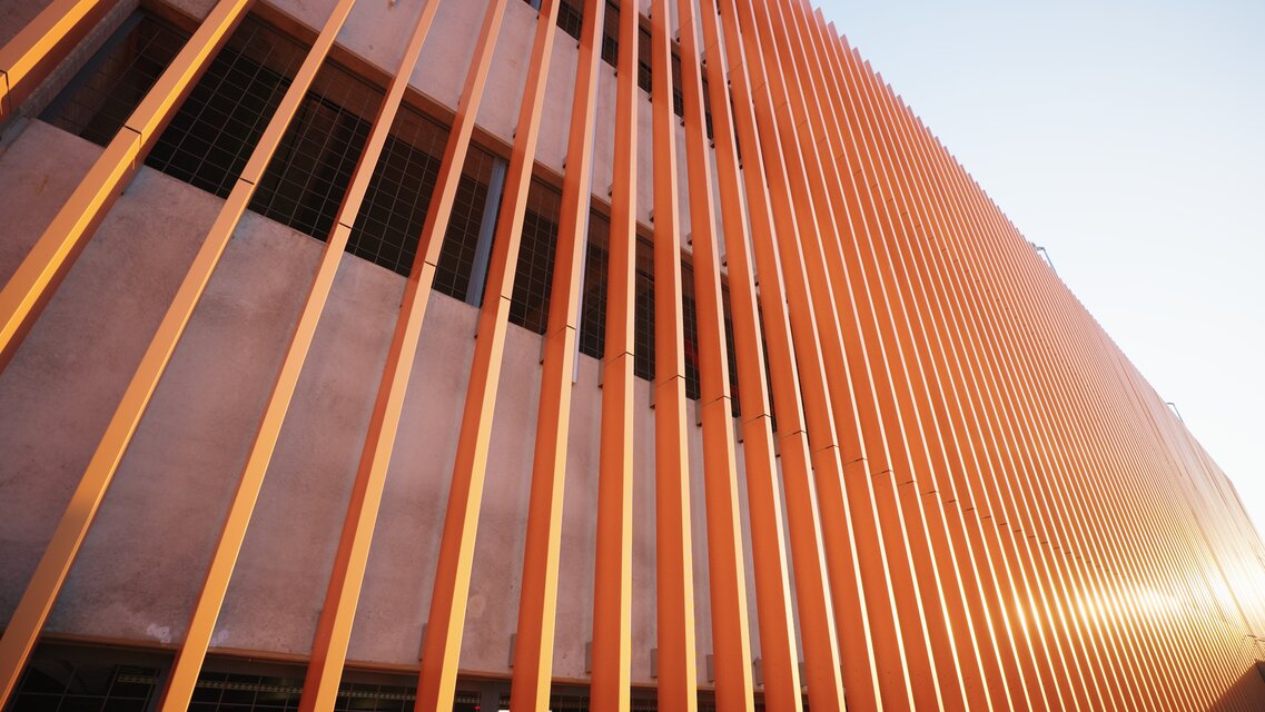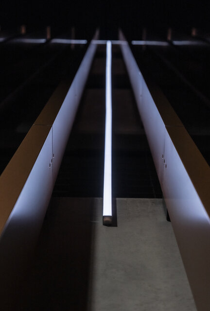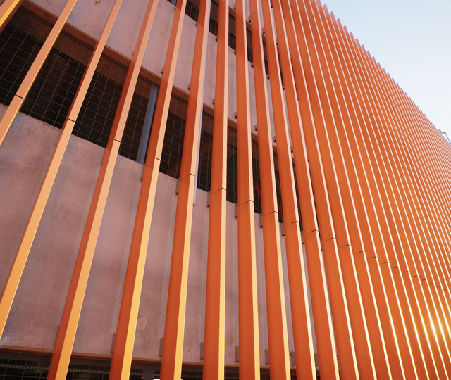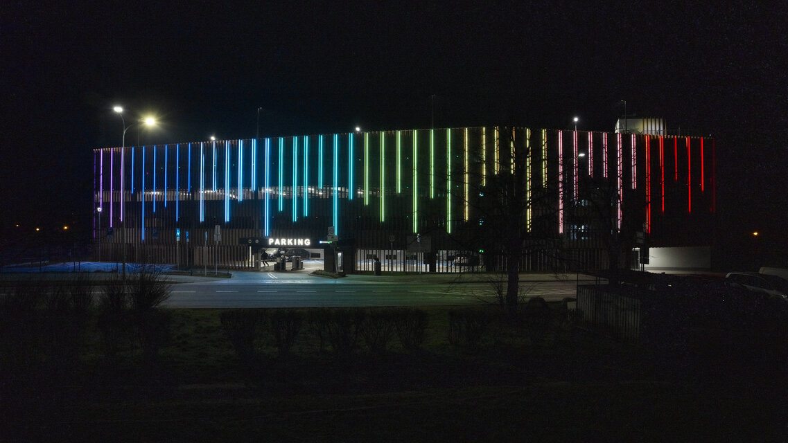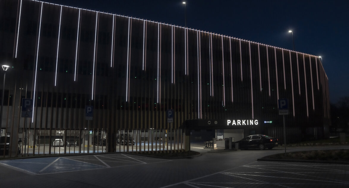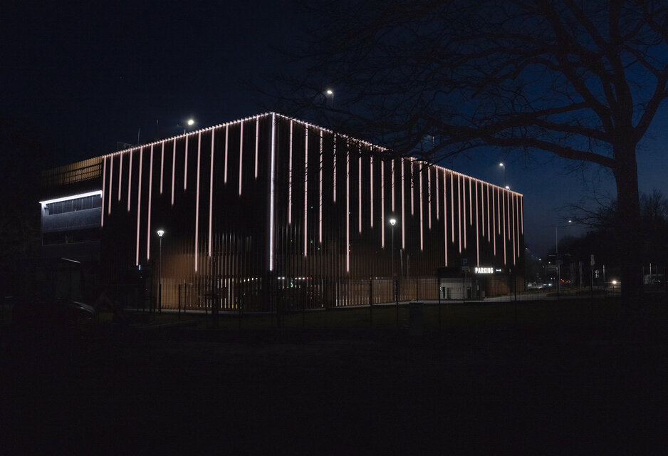 Parkeringsfasaden har vertikale brune profiler som går fra base til tak. or å fremheve lettheten til denne åpne strukturen ble hver fjerde profil opplyst med LED striper som gikk fra taket og nedover, og endte i varierende høyder. TFor å oppnå dette ble det brukt 585 meter med høyytelses RGBW LED striper med IP66-klassifisering. De styres av 81 uavhengig drevne 24V-drivere, som styres trådløst og eksternt. Stripene ble installert i 293 aluminiumsprofiler, hver dekket med frostede diffusorer for å sikre jevn lysfordeling.