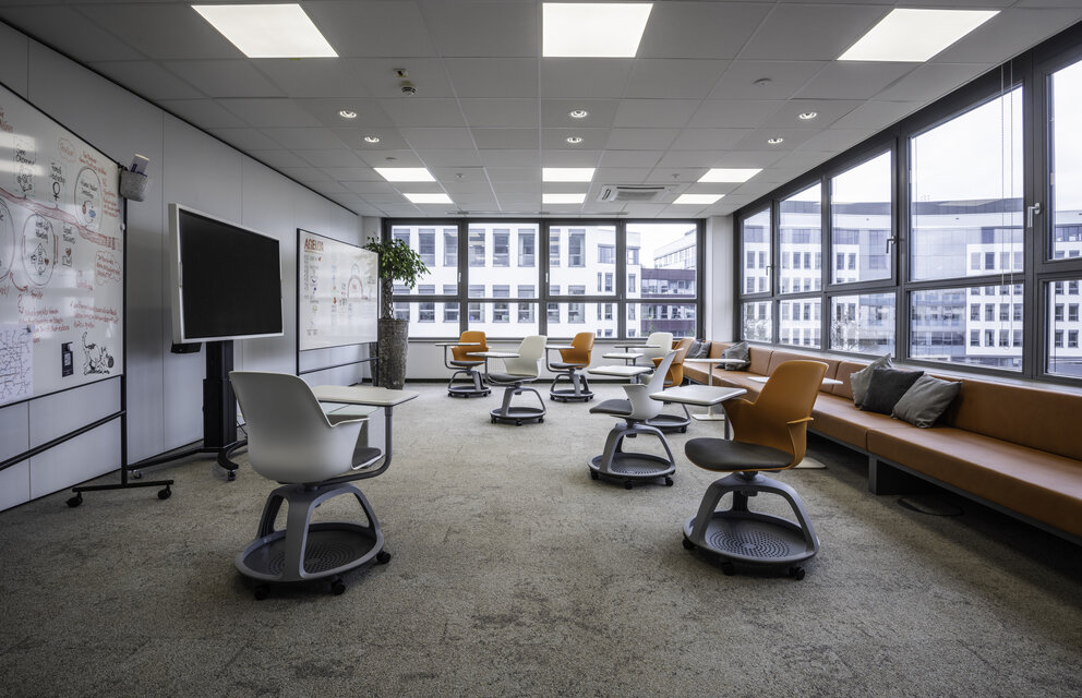 Business Campus Hub er strukturert i ulike områder, hvor LEDVANCE har utviklet belysningsløsninger som er nøyaktig tilpasset kravene til de respektive rommene: Inngangs- og resepsjonsområdet til Business Campus Hub, med svart tak og mangel på takkledning, ga spesielle visuelle utfordringer for vellykket belysning. Derfor ble de dekorative 1906 BUBBLE PENDANT-armaturene valgt for å skape en innbydende og hyggelig atmosfære i dette området uten behov for oppussing, og for å passe harmonisk inn i det moderne kontormiljøet. TRACKLIGHT SPOT-armaturer ble brukt for bedre å fremheve treveggdesignen. De to større sammenhengende trenings- og møterommene er designet for arrangementer med opptil 40 personer. De to rommene er utstyrt med det trådløse VIVARES ZIGBEE-systemet, som kombinerer rask installasjon, enkel idriftsetting og enkel håndtering med effektiv energibruk. Kombinasjonen av PANEL ZIGBEE-armaturer installert i lamelltaket med DOWNLIGHT ZIGBEE-armaturer installert i perifere soner skaper et lysere helhetsinntrykk med ulike dimbare lysscenarier.